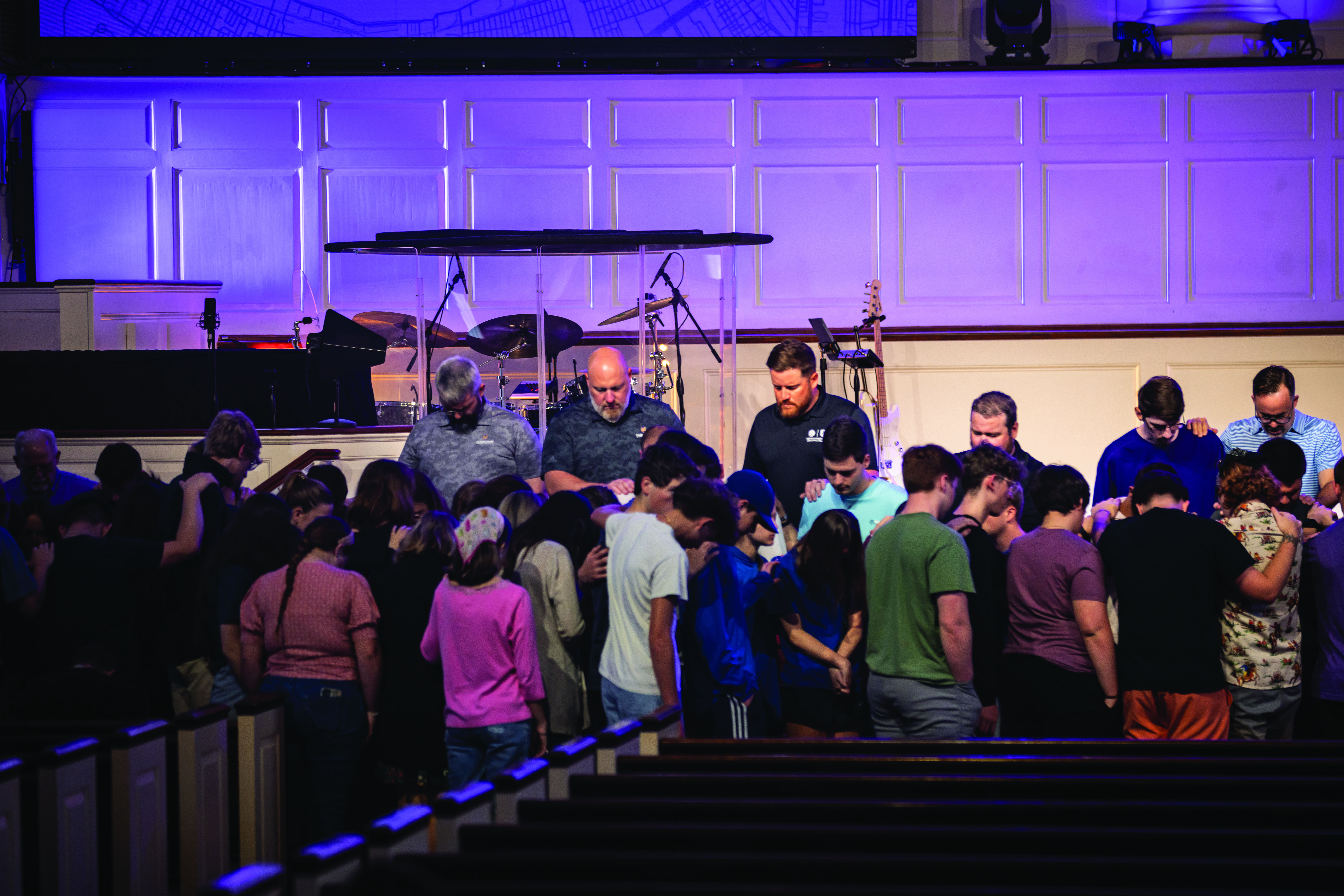 After a message from Greg Wilton, dean of Leavell College, students who will be participating in any form of mission work (either domestic or international) or camp ministry during the summer were asked to come to the front to be prayed over by faculty members.